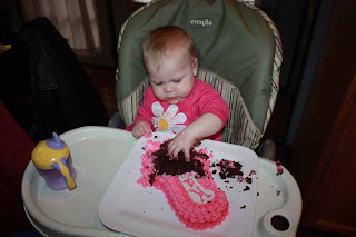 Well, nobody ate my "1" birthday cake so mommy decided to let me destroy it! It was chocolate cake, so I didn't get to eat any of it. Mommy strategically gave it to me after lunch, so I really wasn't hungry and really enjoyed "playing" with it. I had a lot of fun!!!